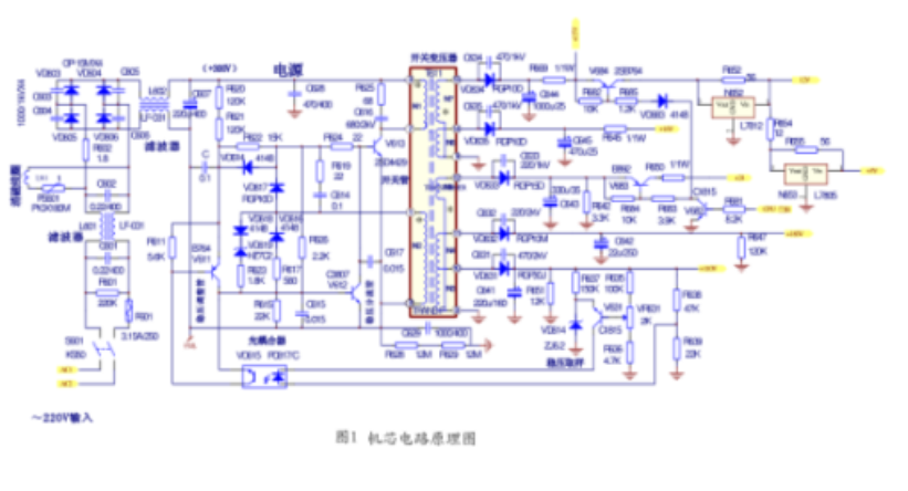 機芯的開關電源具有結構簡單,經濟實用等特點,是彩色電視機用得最多的一種開關電源,廣泛用于新型數碼彩電中。目前康佳、長虹、海信、廈華等品牌彩電,均有許多機型使用了這一電源。本文以A25機芯為例,來分析這種開關電源的工作過程及檢修方法,具體電路見圖1.