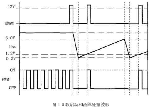 軟啟動和故障處理波形如圖4-5所示。軟啟動是通過軟啟動(SOFT, START)腳的外接電容實現的。接通電源后,軟啟動腳外接電容放電,該腳處于低電平,誤差放大器輸出低電平,開關電源無輸出電壓。當9uA 的內部電流源給軟啟動腳外接電容充電時,誤差放人器輸出電壓逐漸升高,直到閉環調節功能開始T.作,開關電源輸出電壓逐漸升高到額定值。一旦限流(I LIM)腳的電平超過1.2V,故障鎖存器置位,輸出腳變為低電平;同時,軟啟動腳外接電容以250uA的電流放電。在軟啟動電容放完電后,限流腳電平降到1.2V以下時,故障鎖存器就不輸出脈沖。這時,故障鎖存器復位,芯片開始軟啟動過程。