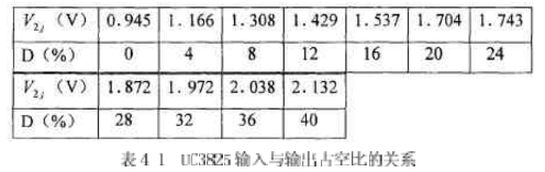 通過實驗可知,UC3825的2腳輸入和outA.、outB輸出的PWM脈沖信號的占空比是滿足線性關系的。具休實驗數據如表4-1所示。我們定義UC3825的2腳輸入為v2,輸出的PM信號占空比為D。從表41中的數據可以看出,端口2的數值范鬧為:0.945V~-2.132v,而 PWM脈沖信號的占空比在0%~-40%之間變化,與上述的結論是吻合的。