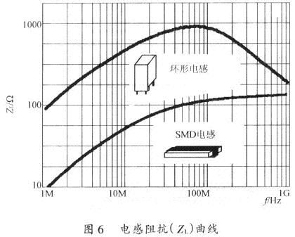 電感通常存在等效并聯電阻(EPR)和等效并聯電容(Cp)二個寄生參數。圖6是電感在不同工作頻率下的阻抗(ZL)。