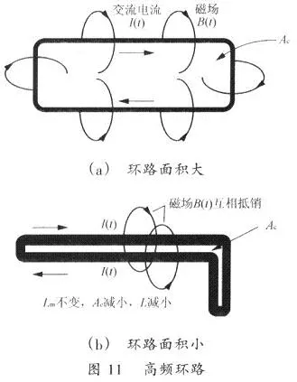 1.4高頻環路開關電源中有許多由功率器件所組成的高頻環路,如果對這△環路處嬋得不好的話,就會對電源的正常工作造成很大影響。為了減小高頻環路所產生的電磁波噪音,該環路的面積應該控制得非常小。如圖l1(a)所示,高頻電流環路面積很大,就會在環路的內部和外部產生很強的電磁于擾。同樣的高頻電流,當環路面積設計得非常小時,如圖11(b)所示,環路內部和外部電磁場互相抵消,整個電路會變得非常安靜。