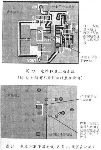 8)開關電源功率電路和控制信號電路元器件需要連接到小同的接地層,這二個地層一般都是通過單點相連接。