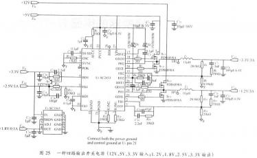 5、開關電源PCB排版例3最后討論一種多路輸出開關電源PCB排版要點。此電源有3組輸入電壓(12V,5V和3.3V),4組輸出電壓(3.3v,2.6V,1.8V,1.2V)。該電源使用了,一集成多路開關控制器(Serotech型號SC2453)。SC2453提供了4.5V~30V的寬輸入電壓范圍,兩個高達700kHz開關頻率和高達15A輸出電流,以及低至0.5V輸出電壓的同步降壓轉換器。它還提供了一個專用可調配正壓線性調節器和一個專用可調配負壓線性調節器。TSSOP-28封裝減小了所需線路板面積。兩個異相降壓轉換器可以減小輸入電流紋波。圖25是這種多路開關電源的原理圖。其中3.3V輸出由5V輸人產生,l.2V輸出由12V輸入產生,2.6V和1.8V輸出由3.3V輸入產生。由于該電源上所有元器件都必須被放置在一個面積較小的PCB上,為此必須將電源的功率地層和控制信號地層分隔開來。參照前面幾節中討論過的要點,首先將圖25中連接到功率地層的元器件和連接到控制信號地層的元器件區分開來,然后將控制信號元器件放在信號地層上并靠近SC2453控制信號地層與功率地層通過單點相連接。這連接點通常會選擇在控制芯片的接地腳(SC2453中的腳21)。圖26詳細描述了該電源排版方式。