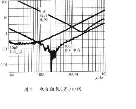 圖2是電容器在不同作業頻率下的阻抗(Zc)。