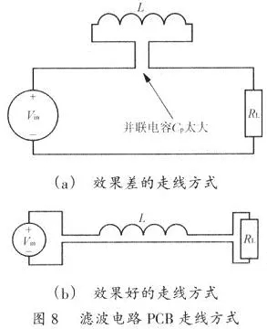 圖8顯現了在一個PCB上Vin經過L至負載(RL)的不同走線方法。為了下降電感的Cp,電感的二個引腳應盡量遠離。而Vin正極至RL和Vin負極至RL的走線應盡量挨近。