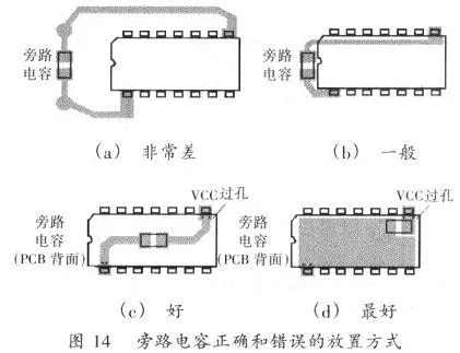旁路電容(Decouple)的放置也要考慮到它的串聯電感值。旁路電容有必要是低阻抗和低ESL乩的瓷片電容。但假如一個高品質瓷片電容在PCB上放置的方法不對,它的高頻濾波功用也就消失了。圖14顯現了旁路電容正確和過錯的放置方法。