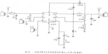 4、開關電源PCB排版例2圖22是另一種降壓式開關電源,該電源能使12V輸入電壓轉換成3.3V輸出電壓,輸出電流可達3A。此電源上運用了一個集成電源操控器(Semtech類型SC4519)。這種操控器將一個功率管集成在電源操控器芯片中。這樣的電源十分簡略,尤其合適應用在便攜式DVD機,ADSL,機頂盒等消費類電子產品。