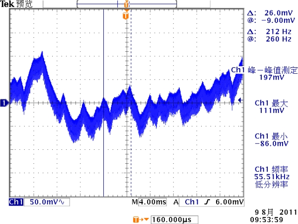 低頻紋波是與輸出電路的濾波電容容量相關(guān)。因?yàn)殚_關(guān)電源體積的約束,電解電容的容量不可能無約束地添加,導(dǎo)致輸出低頻紋波的殘留,該輸出紋波頻率隨整流電路方式的不同而不同。