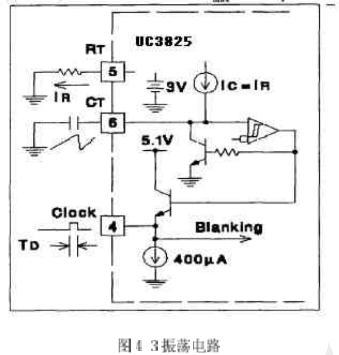 振動(dòng)電路如圖4-3所示。UC3823A、B和UC3825A、B內(nèi)部都有一個(gè)鋸齒波振動(dòng)器。鋸齒波上升沿的斜率由RT、Cr決議,確認(rèn)RT、CT的辦法是:首要依據(jù)要求的最大占空比Dmax、挑選RT,再依據(jù)要求的頻率以及RT和Dmax挑選CT計(jì)算公式為: