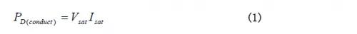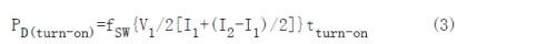 導通損耗可由開關兩端電壓和電流波形乘積測得。這些波形都近似線性,導通期間的功率損耗由式(1)給出。