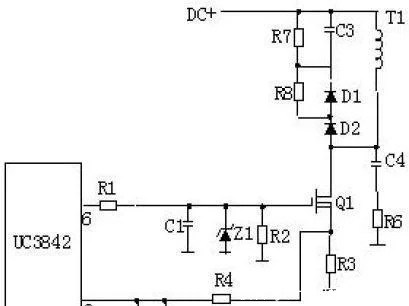 R4、C3、R5、R6、C4、D1、D2組成緩沖器,和開關電源MOS管并接,使開關電源管電壓應力削減,EMI削減,不發生二次擊穿。在開關電源管Q1關斷時,變壓器的原邊線圈易發生尖峰電壓和尖峰電流,這些元件組合一同,能很好地吸收尖峰電壓和電流。從R3測得的電流峰值信號參加當前作業周波的占空比控制,因此是當前作業周波的電流束縛。當R5上的電壓抵達1V時,UC3842停止作業,開關電源管Q1當即關斷。R1和Q1中的結電容CGS、CGD一同組成RC網絡,電容的充放電直接影響著開關電源管的開關電源速度。R1過小,易引起振蕩,電磁煩擾也會很大;R1過大,會下降開關電源管的開關電源速度。Z1一般將MOS管的GS電壓束縛在18V以下,然后保護了MOS管。
