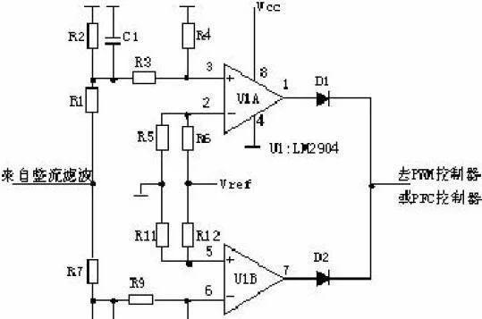AC輸入和DC輸入的開關電源的輸入過欠壓保護原理大致相同。保護電路的取樣電壓均來自輸入濾波后的電壓。取樣電壓分為兩路,一路經R1、R2、R3、R4分壓后輸入比較器3腳,如取樣電壓高于2腳基準電壓,比較器1腳輸出高電平去控制主控制器使其關斷,電源無輸出。另一路經R7、R8、R9、R10分壓后輸入比較器6腳,如取樣電壓低于5腳基準電壓,比較器7腳輸出高電平去控制主控制器使其關斷,電源無輸出。