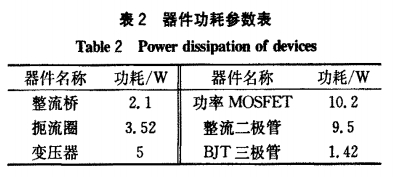 3)功耗參數:本例電源系統的主要發熱元件共有16個,電路中主要發熱器件各接觸面的損耗可由(4)式求得,其中變壓器的損耗可分別由文獻[3]中的銅損及鐵損的計算公式分別求得。本例中將計算得到的各個主要發熱元器件的功率損耗值,依照參數類型歸類整理,如表2所示。