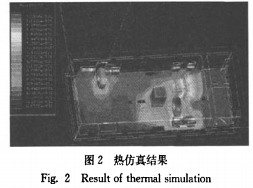 依據主要發熱元器件的損耗計算公式,得到各損耗值,將其導入仿真軟件;應用Ansoft仿真軟件的內部求解器取得實踐電路的3D發熱模型,如圖2所示。從圖中能夠明晰地看到電路內部及各個元器件上的熱量散布狀況。依據仿真結果(圖2)可知,功率MOSFET上的熱量和變壓器的熱量最高(紅色局部),這與從電路理論上剖析求得的這兩種器件的功耗(見表2)相吻合。