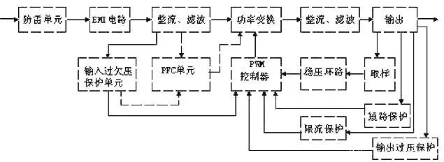 開(kāi)關(guān)電源的電路組成方框圖如下: