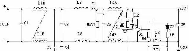② R1、R2、R3、Z1、C6、Q1、Z2、R4、R5、Q2、RT1、C7組成抗浪涌電路。在起機(jī)的瞬間,由于C6的存在Q2不導(dǎo)通,電流經(jīng)RT1構(gòu)成回路。當(dāng)C6上的電壓充至Z1的穩(wěn)壓值時(shí)Q2導(dǎo)通。假如C8漏電或后級(jí)電路短路現(xiàn)象,在起機(jī)的瞬間電流在RT1上產(chǎn)生的壓降增大,Q1導(dǎo)通使Q2沒(méi)有柵極電壓不導(dǎo)通,RT1將會(huì)在很短的時(shí)間焚毀,以保護(hù)后級(jí)電路。